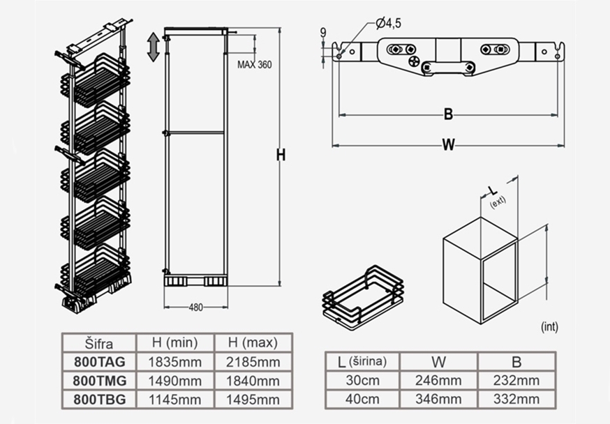 – metalni ram, tj. nosač žičanih korpi prema odabranoj dimenziji unutrašnje visine korpusa