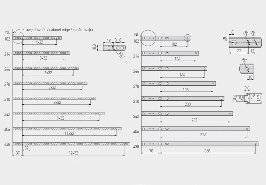 Dužine klizača: 182mm/214mm/246mm/278mm/310mm/342mm/406mm/438mm