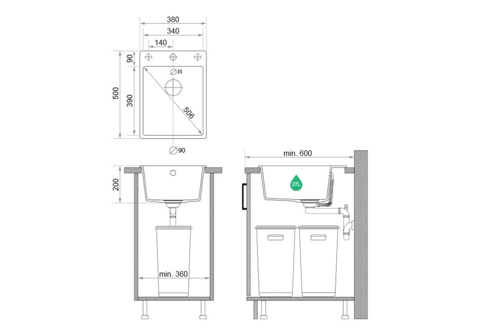 Dubina korita: 200 mm (unutrašnja 190mm)