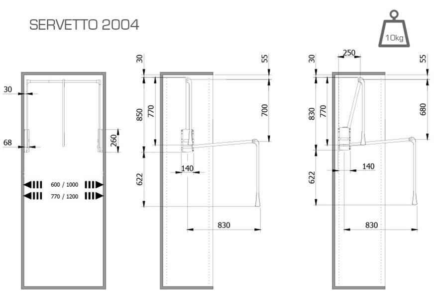 Servetto garderobni lift je praktičan mehanizam koji omogućava spuštanje šipke za vešanje odeće iz gornjih delova plakara na dohvat ruke. Namenjen je za obostrano pričvršćivanje na unutrašnje stranice ormara, nezavisno od širine, jer se šipka može kontinuirano podešavati. Aktivira se povlačenjem centralne ručke na dole, a vraća se u početni položaj jednostavnim guranjem nagore.