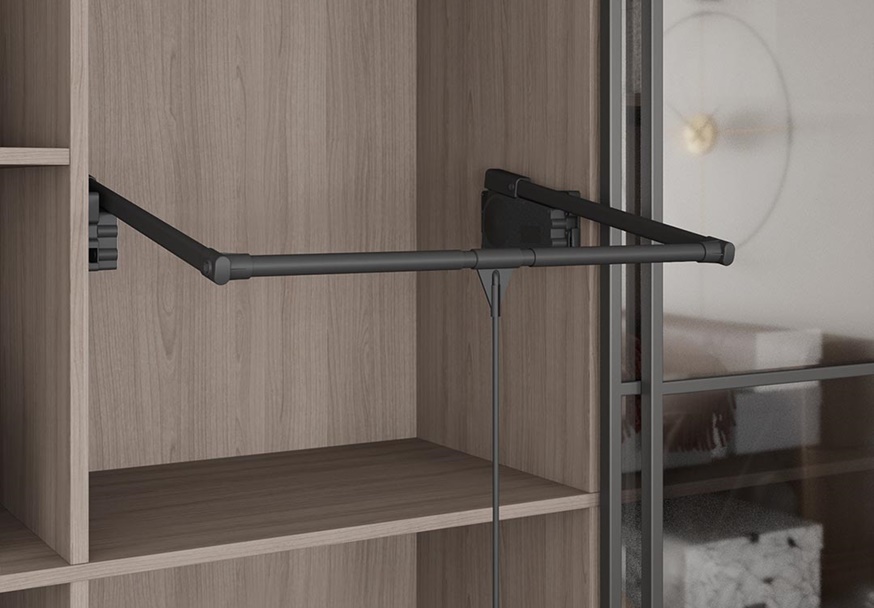 STARAX garderobni lift je praktičan mehanizam koji omogućava spuštanje šipke za vešanje odeće iz gornjih delova plakara na dohvat ruke. Namenjen je za obostrano pričvršćivanje na unutrašnje stranice ormara, nezavisno od širine, jer se šipka može kontinuirano podešavati. Aktivira se povlačenjem centralne ručke na dole, a vraća se u početni položaj jednostavnim guranjem nagore.