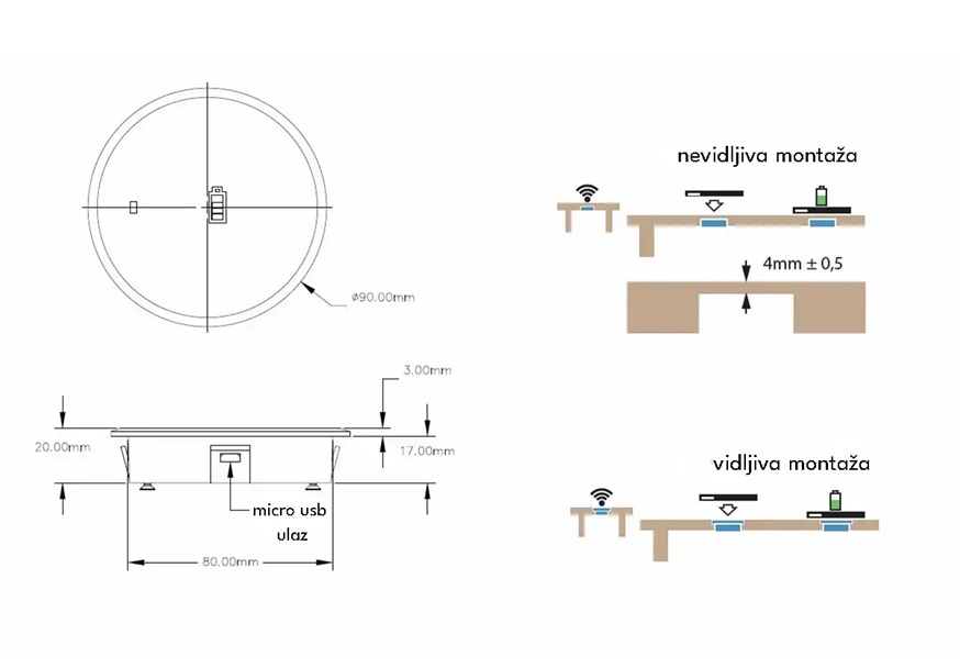 Ugradnja: namontiran uređaj može biti vidljiv ili nevidljiv (debljina materijala do 4mm) pogledaj VIDEO